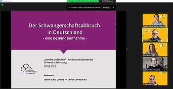 Auch in der vorlesungsfreien Zeit setzt der AK Gender seine Vortragsreihe zu „Gender und Politik“ im Wintersemester 2021/22 fort. Am 07.03.2022 hielt Leonie Kühn, stellvertretende Vorsitzende von Doctors for Choice Germany e.V. (https://doctorsforchoice.de/), einen Vortrag mit dem Titel „Der Schwangerschaftsabbruch in Deutschland - eine Bestandsaufnahme“.