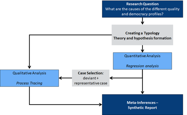 In a first step in the work process, the conceptual framework of the different quality and democracy profiles will be elaborated for the purpose of creating a comprehensive typology. We will then test the extent to which the conceptual reflections on the quality and democracy profiles can be empirically verified by way of a cluster analytic procedure using the democracy matrix data set. Next comes theory and hypothesis formation concerning the causes of the quality profiles, on the one hand, and concerning the causes of the democracy profiles, on the other. This is the point of departure for the subsequent quantitative analysis (regression analysis), which makes possible an initial testing of the hypotheses both on the quality profiles and on the democracy profiles. The results of this step in the work process then orient the case selection for the qualitative analyses (deviant case design) in the form of a mixed methods design: deviant cases, which contradict the hypotheses and theories, are then subjected to a qualitative re-analysis by way of process tracing. In addition, a comparative study will also be done of representative cases. The last key work-process step in this phase consists of an overall comparison of the results of the quantitative and the qualitative methods and thus aims at the meta-inferences that are of importance for mixed methods.