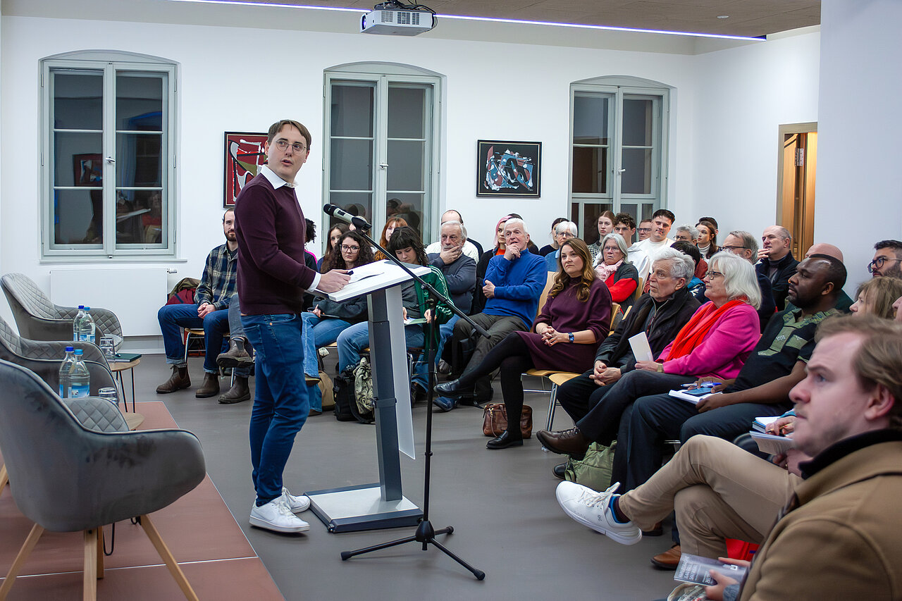 Moderated by Dr. Julien Bobineau (JMU alumnus), a lively interdisciplinary dialogue unfolded at the Schelling Forum of the Bavarian Academy of Sciences and Humanities. Political scientist Dr. Lilli Banholzer (Bavarian Research Alliance for Peace, Security and Conflict – FoKS) and literary scholar Prof. Dr. Gilbert Shang Ndi (University of Bayreuth / BAdW) explored how music and literature function as seismographs of social tensions.