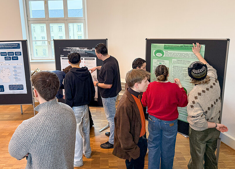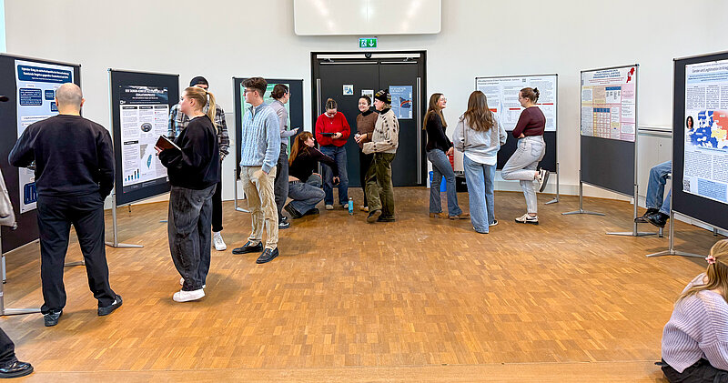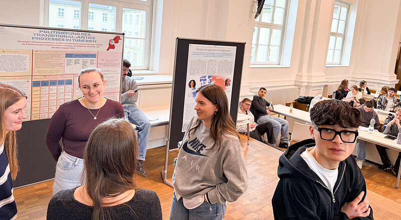 Im Seminar "Friedens- und Konfliktforschung" von Dr. Philipp Gieg gestalteten die Studierenden im Wintersemester 2025/26 in Kleingruppen wissenschaftliche Poster zu internationalen Konflikten. Am Ende des Semesters präsentierten die Gruppen ihre Poster im Rahmen einer Poster-Session.