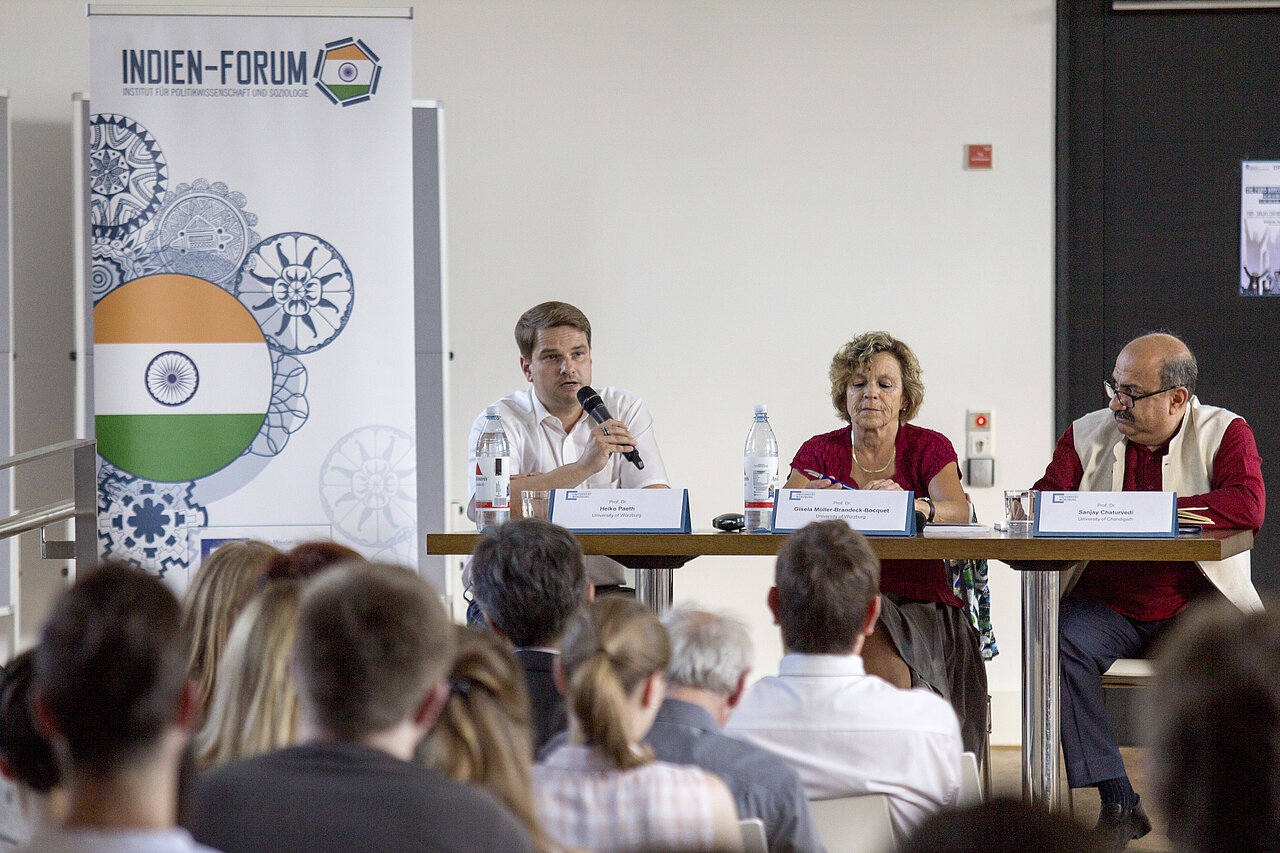 Nach diesen Anfangsstatements leitete Prof. Müller-Brandeck-Bouquet die nun folgende Debatte mit der provokanten Aussage ein, das Pariser Abkommen sei ein Opfer von Klima-Reduktionismus à la Mike Hume geworden. Prof. Chaturvedi stimmte dem teilweise zu und warnte in diesem Zusammenhang vor einer Determination des politischen Diskurses durch den Klimawandel. Dies zu verhindern, sei seiner Ansicht nach ein wichtige Frage für die Sozialwissenschaften. Die Forderung nach einer größeren Rolle der Sozialwissenschaften betonte er auch, als Prof. Müller-Brandeck-Boucquet die Rolle von Demographie und Bevölkerungswachstum hinsichtlich des Klimawandels in die Diskussion einbrachte. Durch die demographischen Konsequenzen des Klimawandels wie beispielsweise Klimaflucht komme es, so Prof. Chaturvedi, derzeit zu einer „Versicherheitlichung“ des Klimawandels. Um derartige Aspekte in der Forschung angemessen berücksichtigen zu können, forderte er daher eine „social natural science“ und betonte auch hier die Rolle der Sozialwissenschaften in der Suche nach politischen Lösungen für den Klimawandel. Den Sozialwissenschaften käme nicht zuletzt deshalb eine so große Rolle im Ringen um eine Rettung des Weltklimas zu, weil, wie Prof. Müller-Brandeck-Bouquet es formulierte, die Unterzeichnung bindender Abkommen durch alle Staaten nicht zu erwarten sei, nicht-bindende Abkommen aber keine weit genug reichenden Konsequenzen hätten.