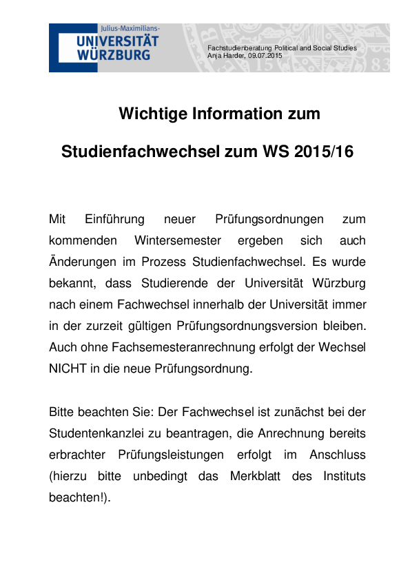 Achtung! Wichtige Informationen zum Studienfachwechsel zum WS 2015/16 09.07.2015 Bitte beachten Sie den folgenden Aushang der Fachstudienberatung. Informationen zum Studienfachwechsel zum WS 2015/16 zum Download. Weitere Bilder Zurück
