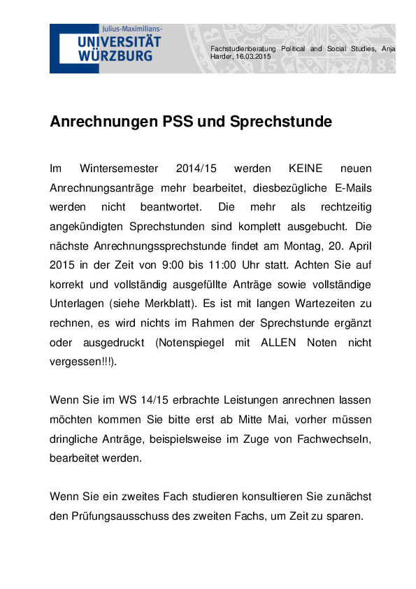 Im folgenden Aushang finden Sie Informationen zu Anrechnungsanträgen im Wintersemester 2014/15.