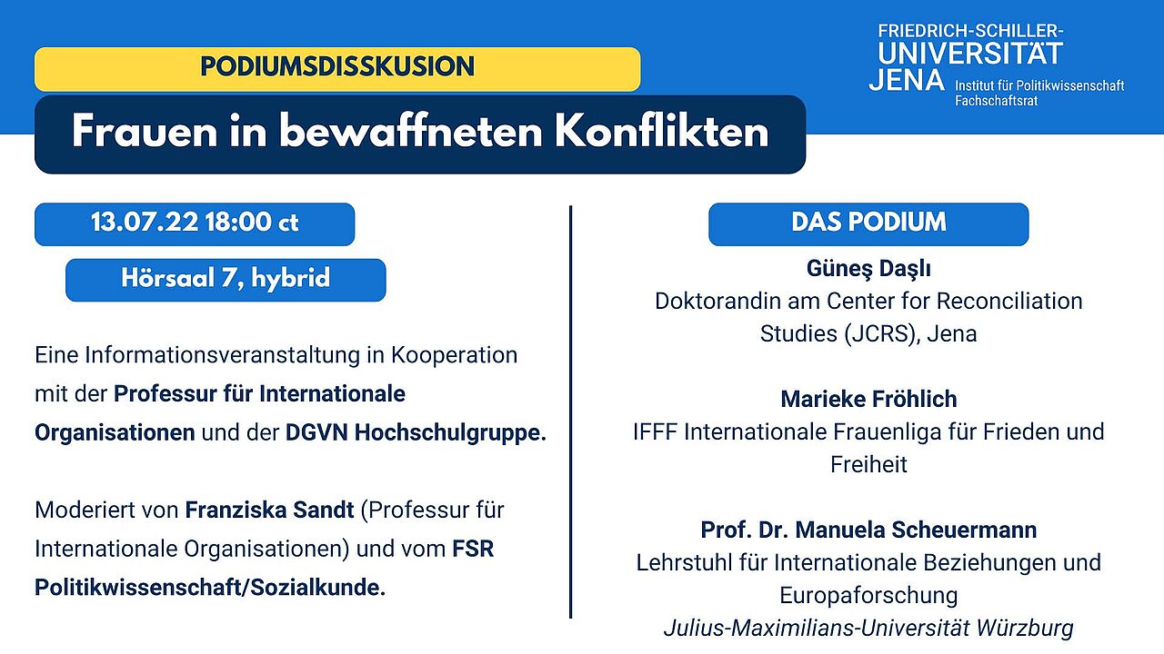 Prof. Dr. Scheuermann nimmt am 13.07 an einer hybriden Podiumsdiskussion zum Thema "Frauen in bewaffneten Konflikte" an der Uni Jena teil. Zur Veranstaltung gibt es einen Livestream über https://www.uni-jena.de/livestreams (Hörsaal 7). Fragen können an fsrpowi@uni-jena.de gestellt werden.