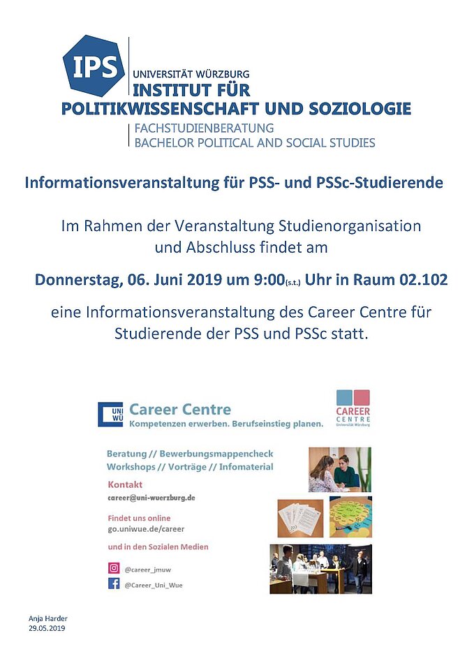 29.05.2019Im Rahmen der Veranstaltung Studienorganisation und Abschluss findet eine Informationsveranstaltung des Career Centre für Studierende der PSS und PSSc statt.