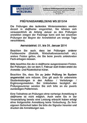 Prüfungsanmeldung im WS 2013/14 19.12.2013 Bitte beachten Sie die Informationen der Fachstudienberatung zur Prüfungsanmeldung im WS 2013/14. Hier finden Sie die Informationen zum Download. Zurück