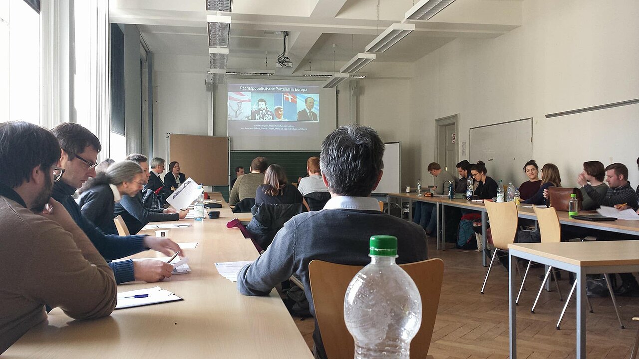 Unter dem Oberthema „Populismus/Nationalismus“ wurden insgesamt acht unterschiedliche Projekte im Wintersemester 2017/18 bearbeitet. Die Studierenden entwickelten eigene Fragestellungen, entwarfen ein Forschungsdesign und präsentierten nun abschließend die (ersten) Forschungsergebnisse in einer Lehrbereich-übergreifenden Veranstaltung.