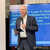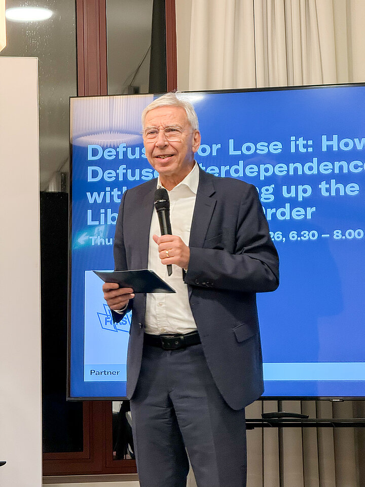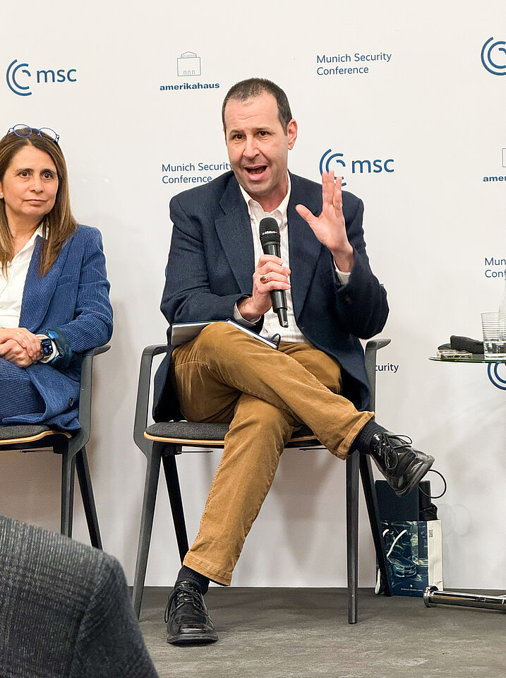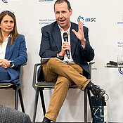 Am Abend des ersten Assembly-Tages organisierte die Allianz im Amerika-Haus einen Side Event der Münchner Sicherheitskonferenz. Eröffnet wurde die Veranstaltung von Prof. Tobias Bunde, Director of Research & Policy bei der MSC, und Prof. Udo Hebel, Vorsitzender des Präsidiums der Wissenschaftsallianz und Präsident der Universität Regensburg. Prof. Jana Hönke (Universität Bayreuth und FoKS-Fellow) moderierte die anschließende Debatte unter dem Titel "Defuse it or lose it: How to defuse interdependence without blowing up the liberal world order". Prof. Abraham L. Newman von der Georgetown University in Washington D.C. diskutierte mit Prof. Dr. Prof. Dr. Eugénia da Conceição-Heldt (TUM und FoKS-Fellow) und PD Dr. Anreas Kruck (LMU und ebenfalls FoKS-Fellow).