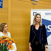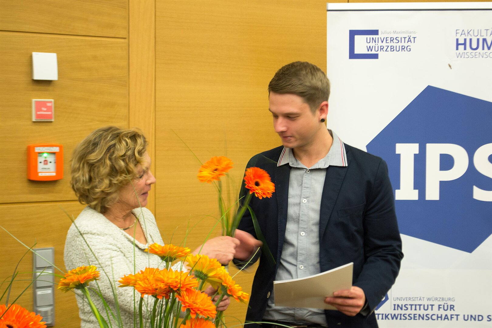 Ungefähr 100 Angehörige der AbsolventInnen sowie zahlreiche MitarbeiterInnen des IPS wohnten der Zeremonie bei, die Prof. Müller-Brandeck-Bocquet als geschäftsführender Vorstand des Instituts eröffnete. Hannah Friederike Häußler ließ in ihrem Grußwort stellvertretend für alle AbsolventInnen die Studienzeit Revue passieren.