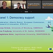 On 6 December, Prof. Dr. Sonja Grimm (representing EMBRACE) presented results of her Horizon Europe-funded project EMBRACE in a half-day webinar to EU Commission officials, mainly from the Directorate General for Neighbourhood and Enlargement Negotiations (DG NEAR) and the Directorate General for International Partnerships (DG INTPA). She was accompanied by Prof. Tina Freyburg fom the University of St Gallen in Switzerland (representing the HE-project REDEMOS), and Dr. Magdalena Góra from the Jagiellonian University in Poland (representing the HE-project Shapedem-EU). The audience also included participants from a total of seven sister and cousin projects funded by the Horizon Europe research framework. These research consortia study the European Union’s neighbourhood and enlargement policies and their impact on neighbouring and accession countries in order to explore new avenues for these policies in light of current conflicts and crises.