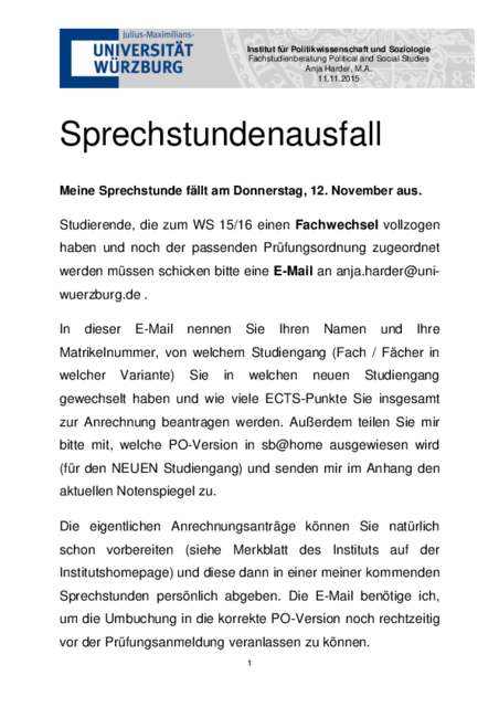Sprechstunde von Frau Harder am 12.11. entfällt - Kurzinfo zu Fachwechsel 11.11.2015 Bitte beachten Sie den Aushang der Fachstudienberatung. Aushang zum Download Zurück