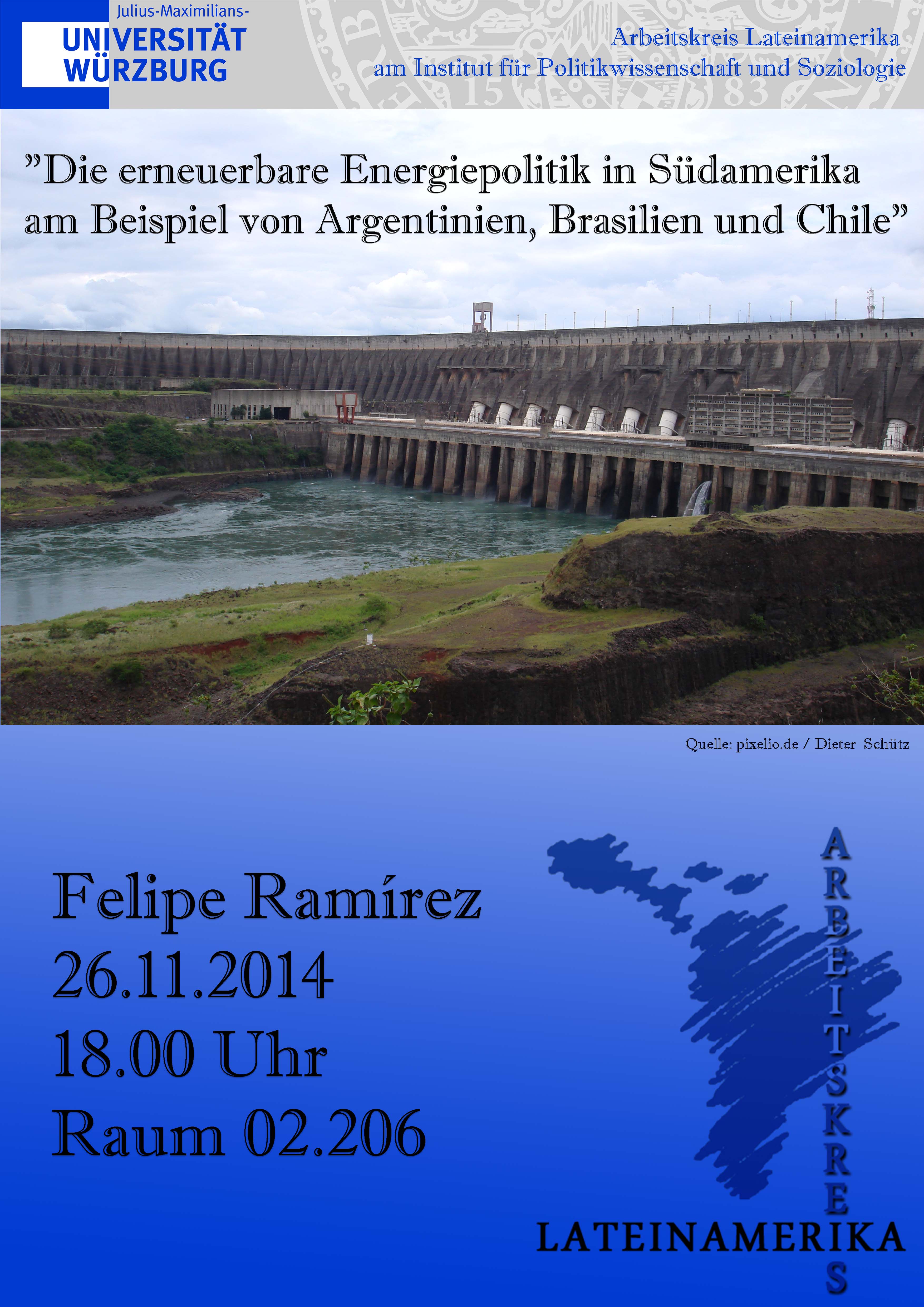 Felipe Ramírez spricht zum Thema "Die erneuerbare Energiepolitik in Südamerika am Beispiel Argentinien, Brasilien und Chile". Veranstaltungsort ist Raum 02.206 am Wittelsbacherplatz 1.